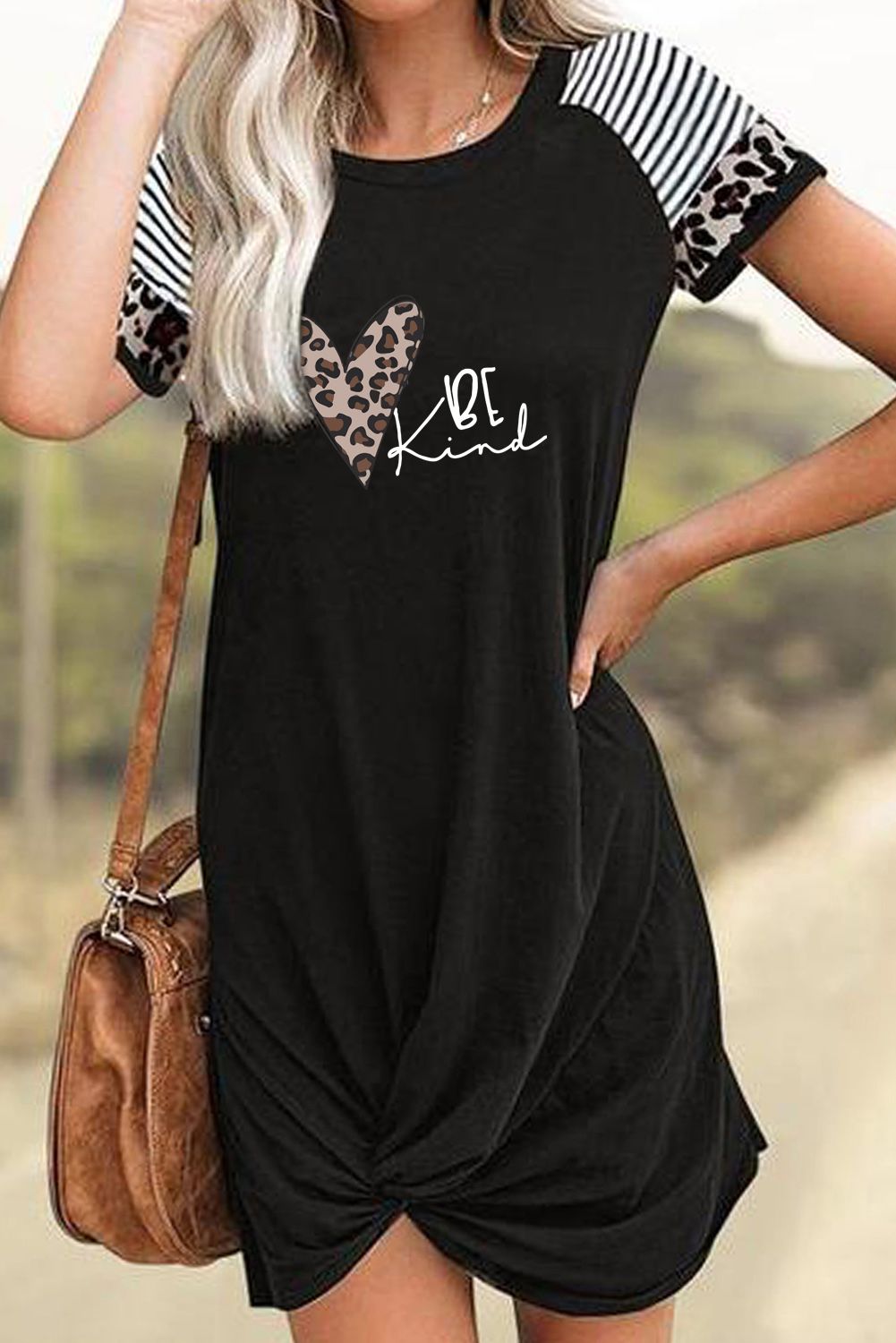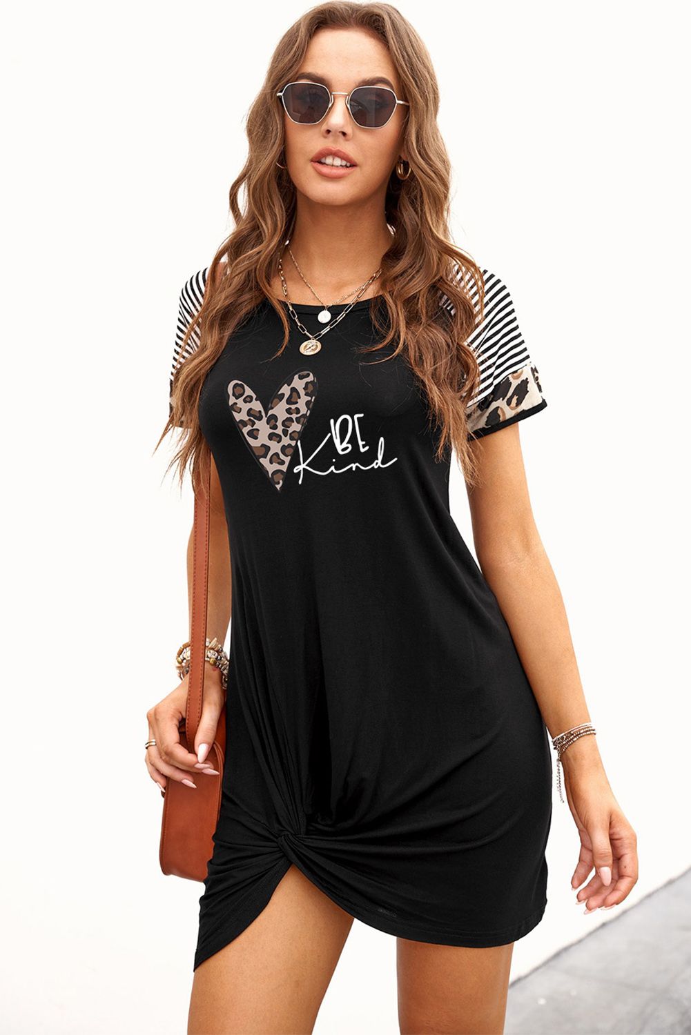 Features striped leopard mixed prints at sleeves, letter and hearts on the frontCasual mini dress with crew neck, short sleeves, twisted hem and loose fit designMade from premium and super soft, this shift dress is cozy, stretchy and breathable on your skin, you’ll stay comfy all day longShort dress with a loose and straight design can well modify your figureGraphic dresses wholesale are perfect to pair with your high heels or sneakers as a good choice