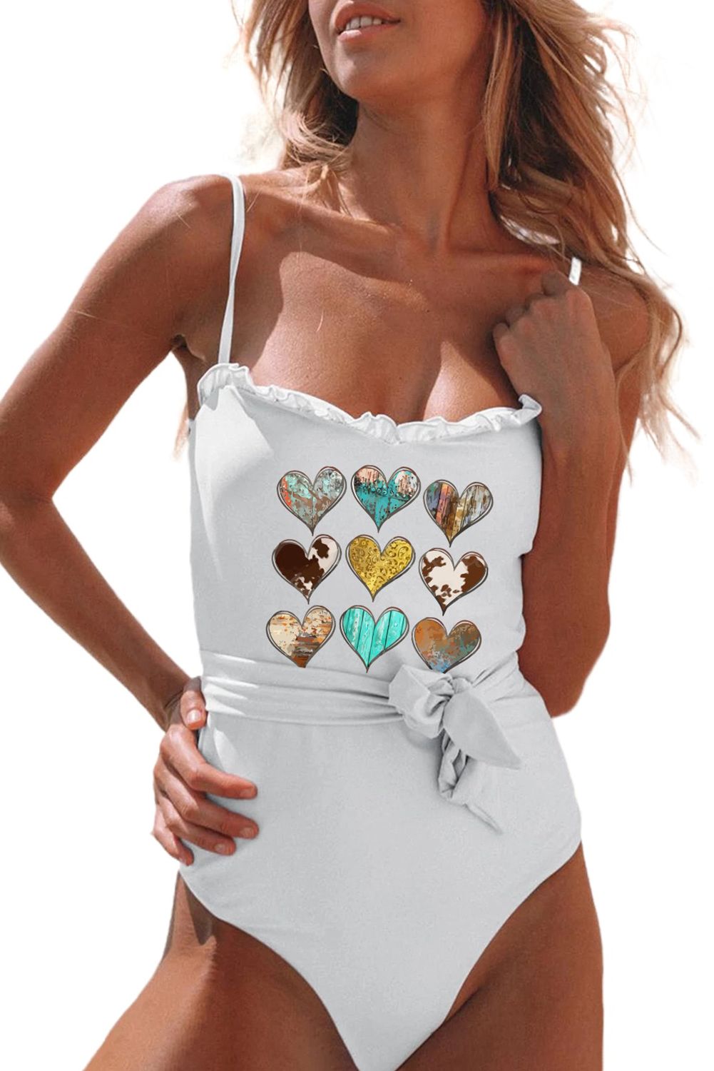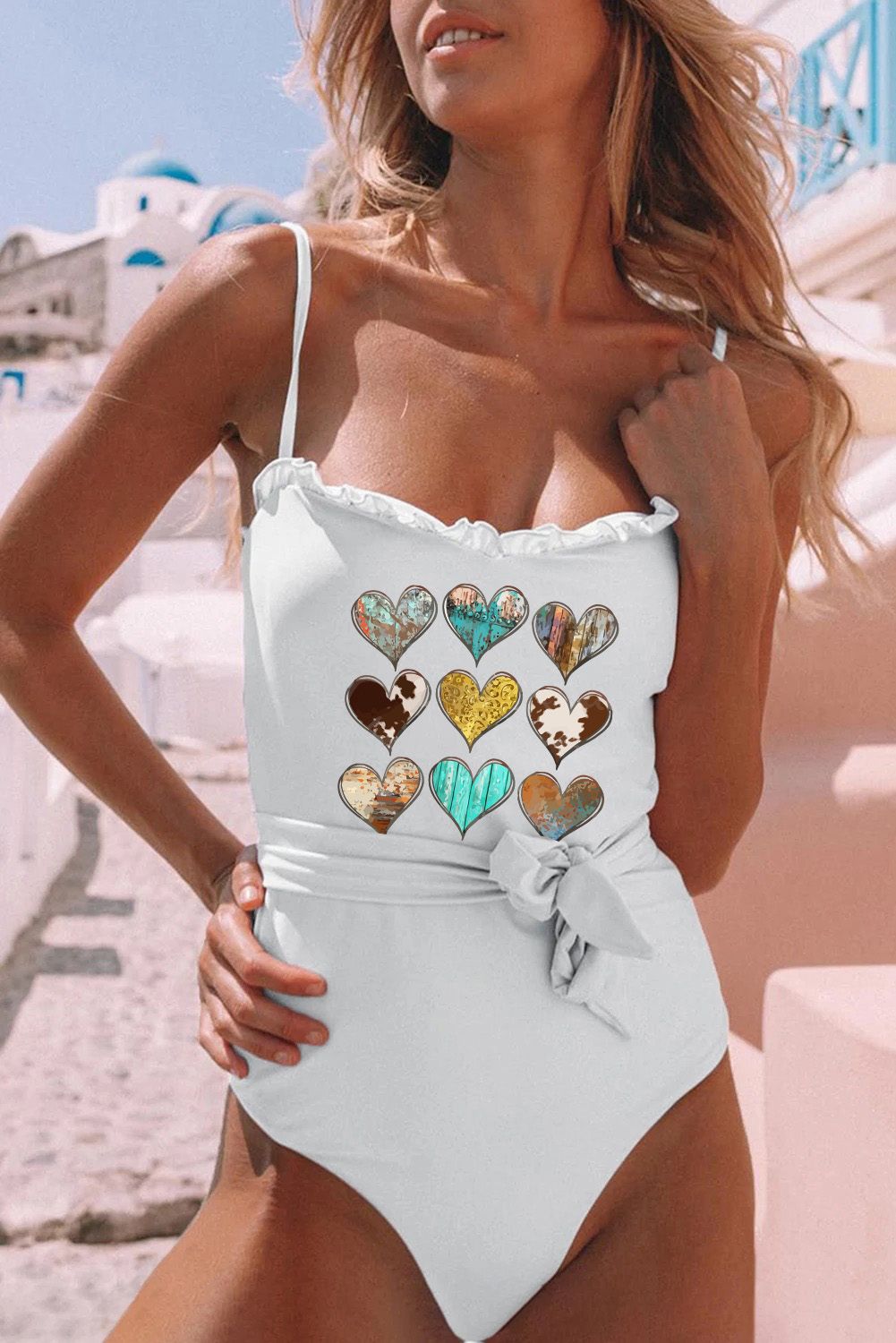 White Western Heart-shape Print Frilled Lace-up One-piece Swimwear