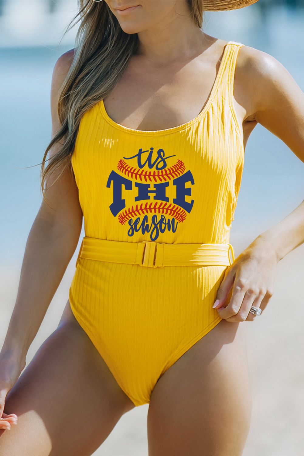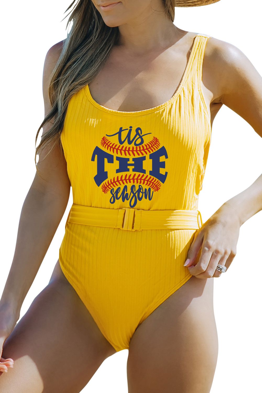 Yellow Baseball Letter Print Ribbed Backless One-piece Swimwear