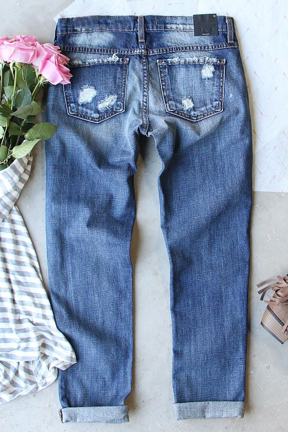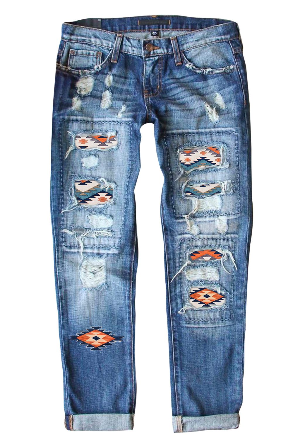 Sky Blue Western Aztec Pattern Splicing Distressed Jeans