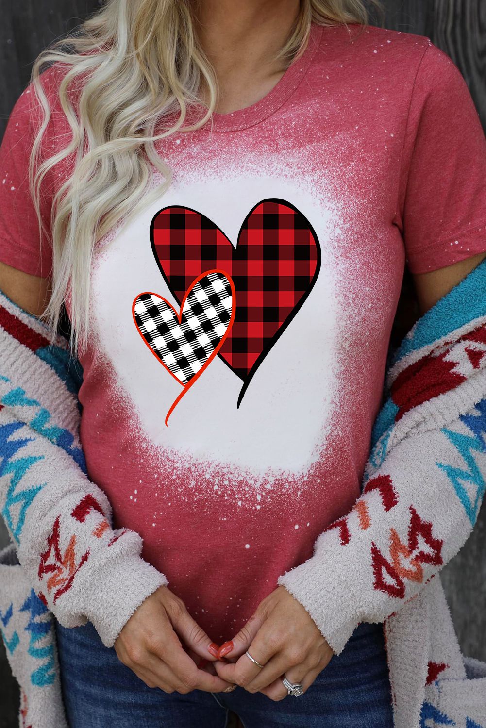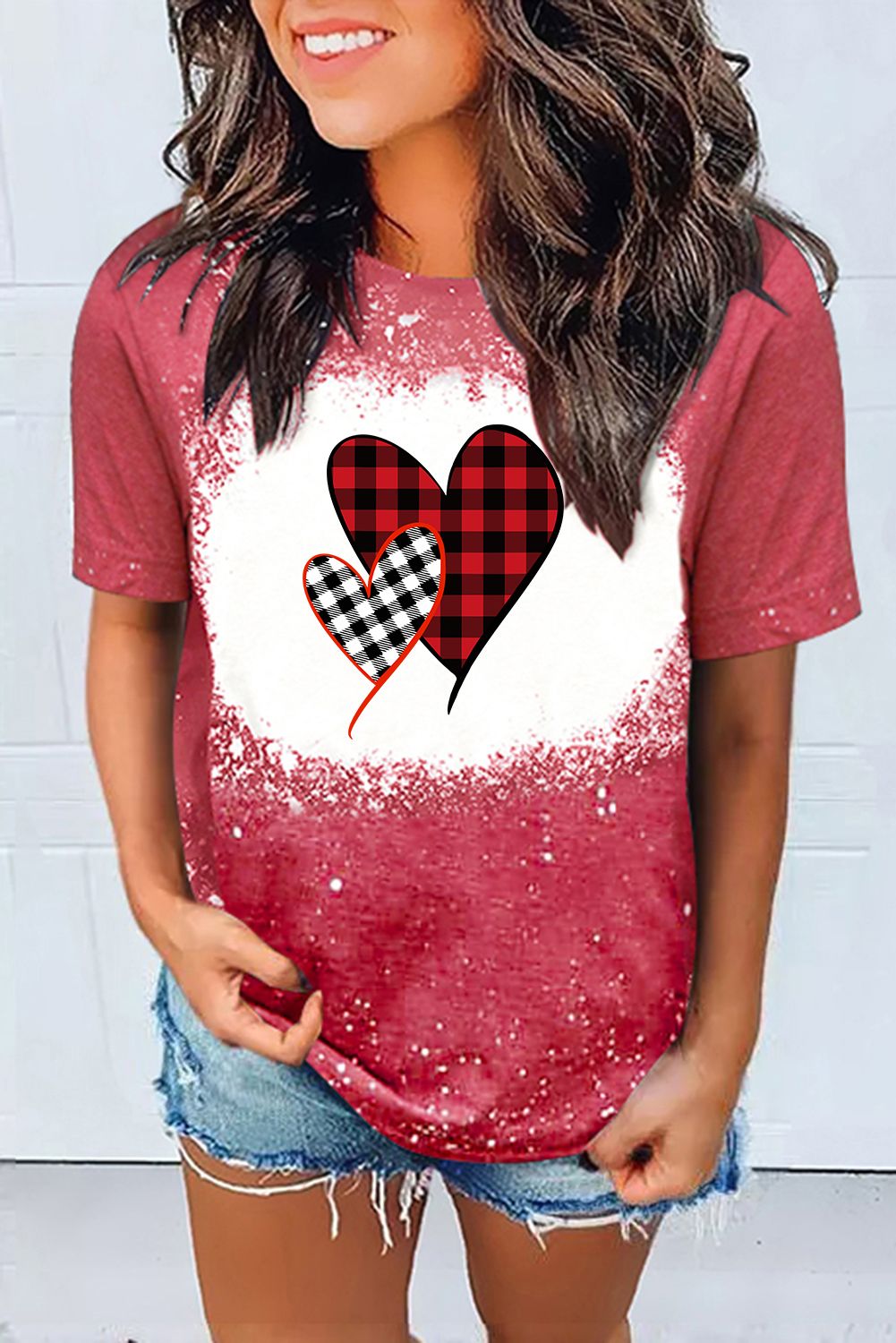 Valentine Plaid Heart Shaped Print Crew Neck Short Sleeve T-shirt