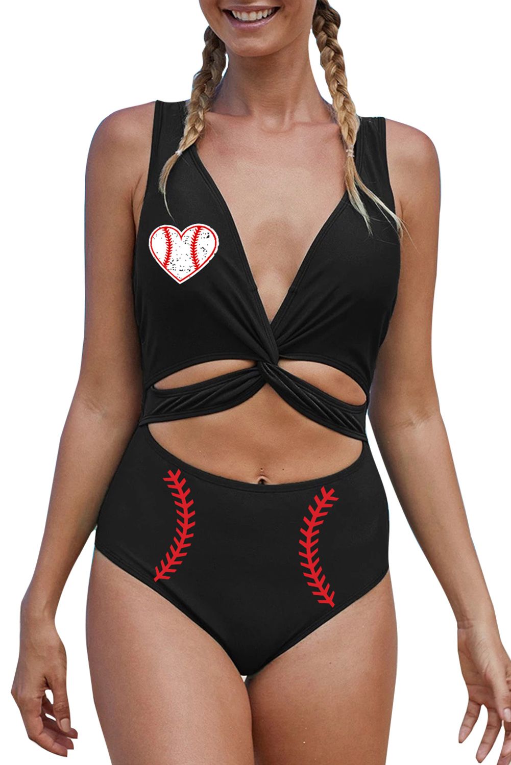 Baseball Heart Print Cut-out Criss Cross One-piece Swimwear