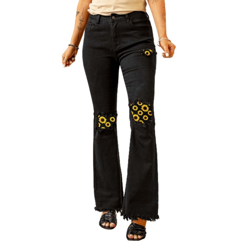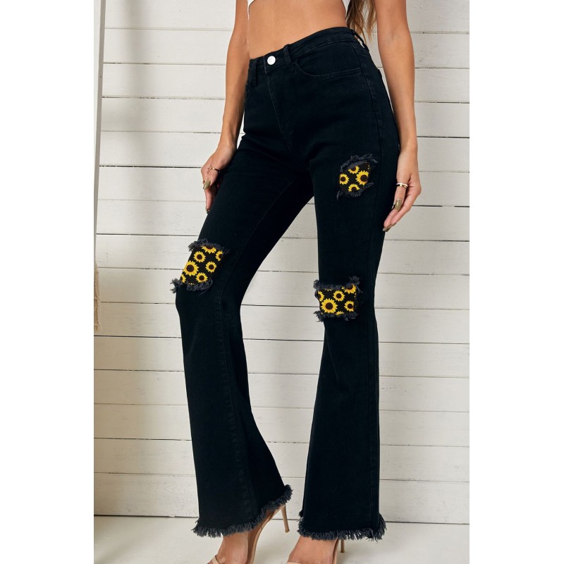 Black Sunflower Patchwork Raw Hem High Rise Flare Jeans