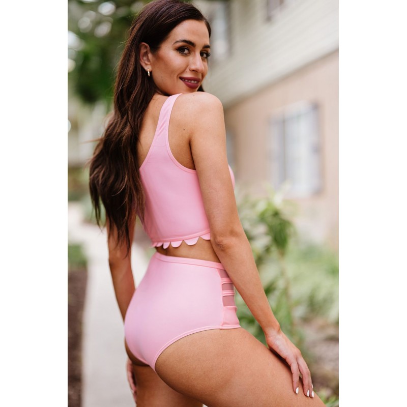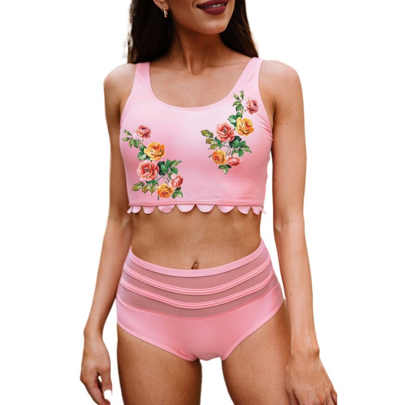 Pink Floral Print Scalloped Sleeveless High Waist Bikini Swimsuit